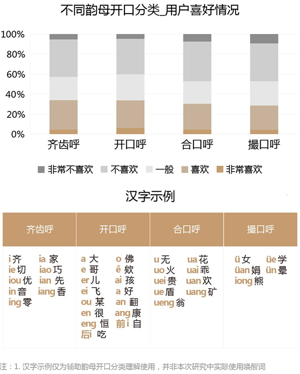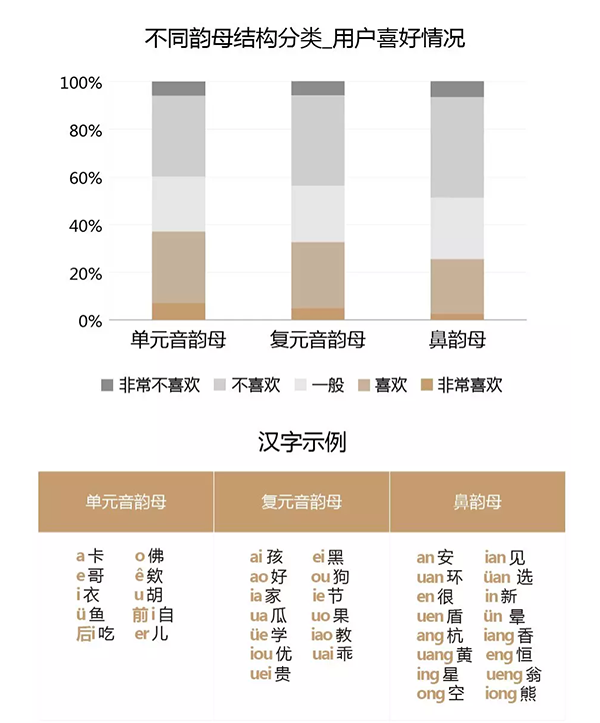 · 韵母: 按照韵母发音时的口型开口情况来看,用户更喜欢开口口型较大的齐口呼和开口呼;另外按照韵母结构来看,音节韵母为单韵母的词最受用户的喜欢。