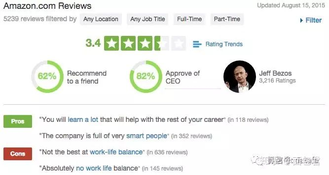 通过美国招聘网站 Glassdoor 上员工给公司的打分可以看出,在美国科技公司里,亚马逊在员工心目中的评分偏低。一位前亚马逊高管 John Rossman 表示,“很多人都认为,亚马逊是我最讨厌为之工作的伟大的公司(It’s the greatest place I hate to work)”。评分和亚马逊一样低的有特斯拉,也存在让员工又爱又恨的公司文化。
