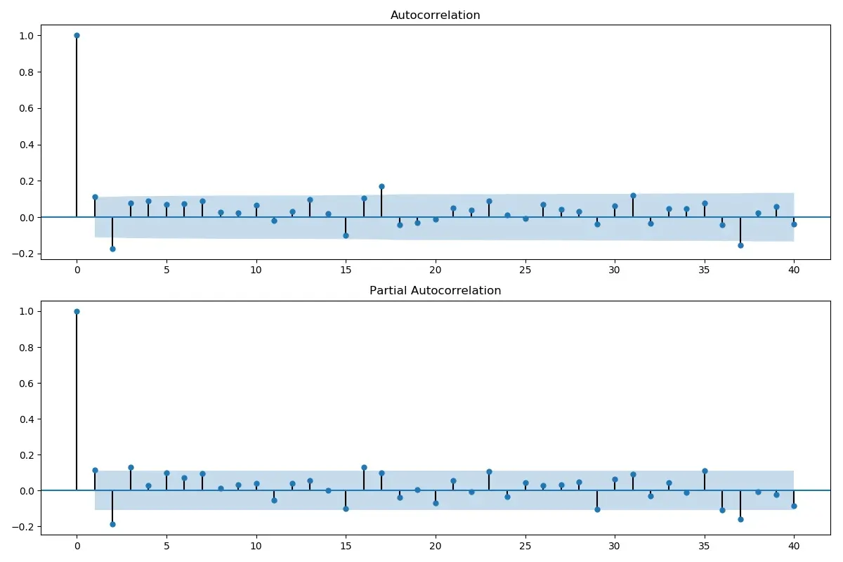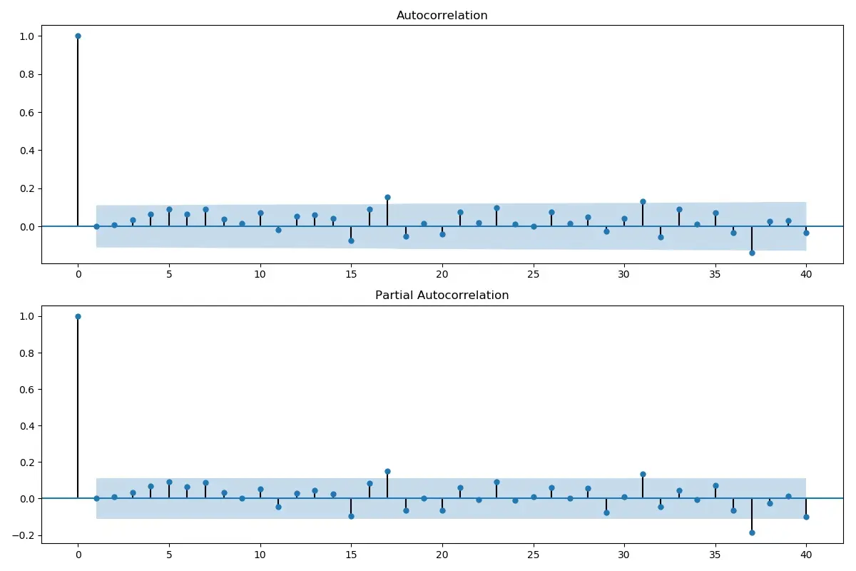 - 根据Q校验的方法, 在95%的置信区间内, 当Prob大于0.05当前残差序列不存在自相关性, 因此滞后40个数据的模型属于基本不存在自相关性。