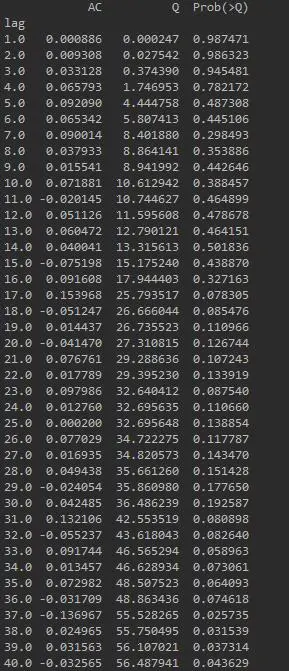 table = pd.DataFrame(data, columns=['lag', "AC", "Q", "Prob(>Q)"])