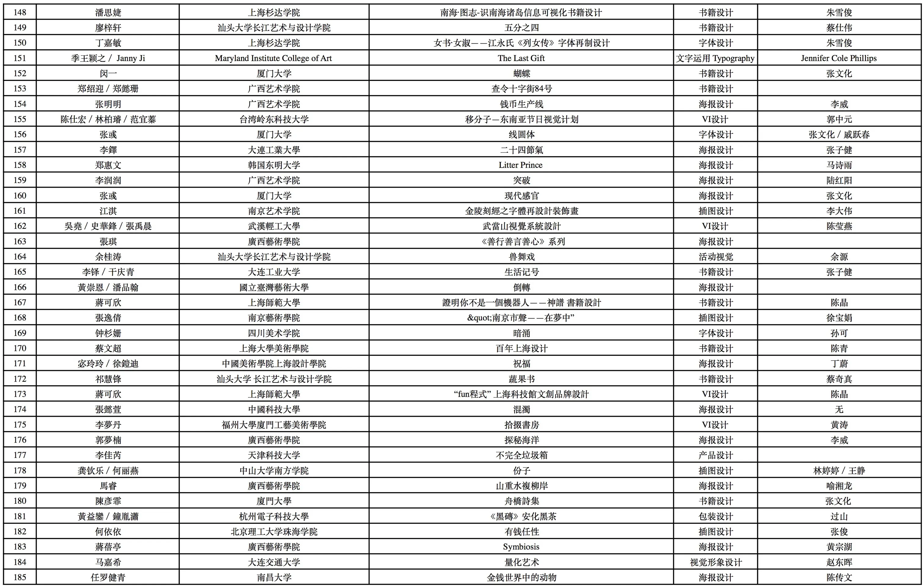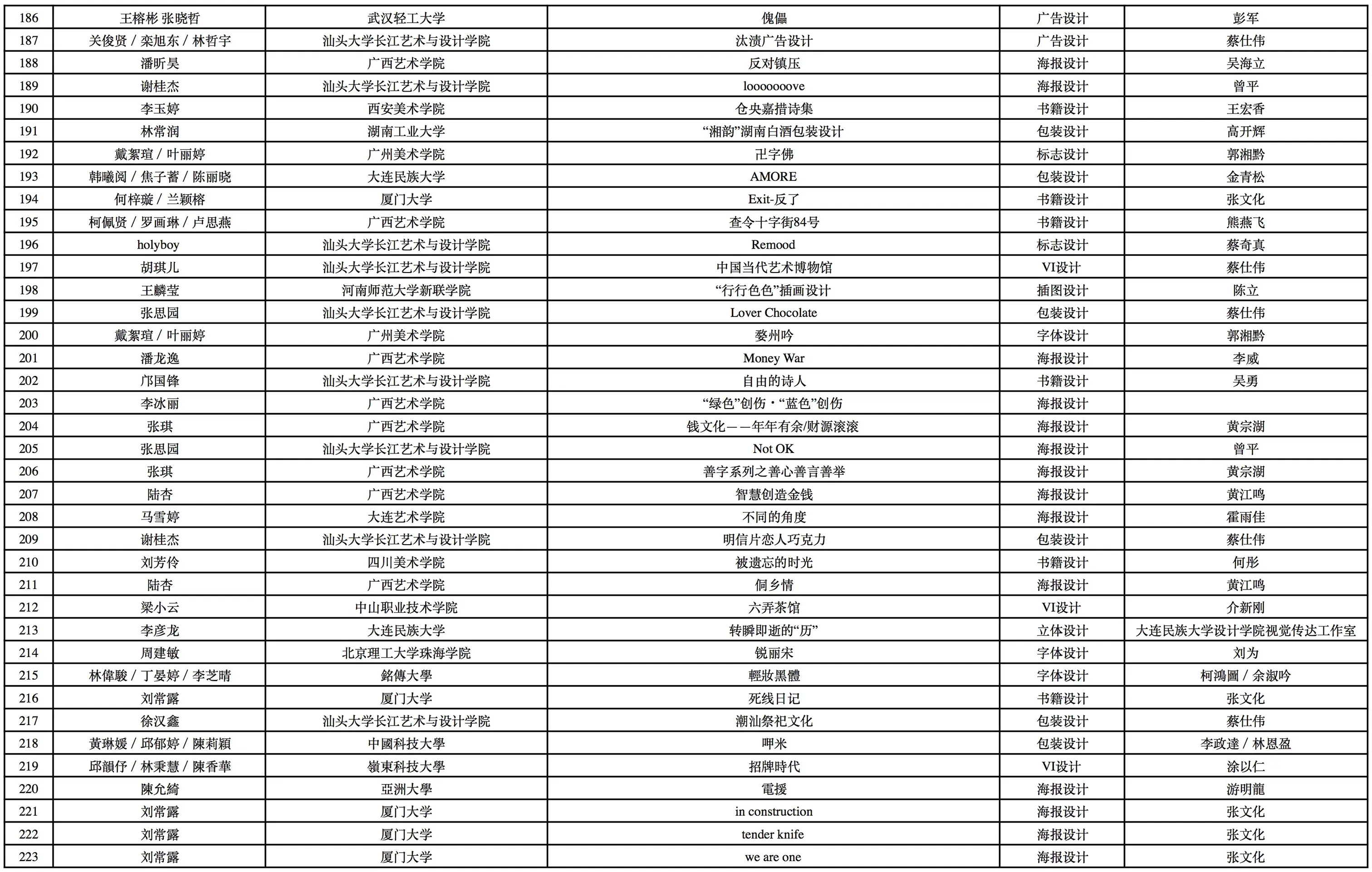 担任本次比赛初评评委的是:中国美术学院艺术设计学院副院长陈正达,香港著名设计师毛灼然、澳门著名设计师刘华智、厦门大学艺术学院教授张文化、汕头大学长江艺术与设计学院副教授蔡仕伟以及著名书籍设计师潘焰荣。六位评委采用分组投票方式进行评审,经过三轮投票及讨论,最终选出专业组59件及学生组323件进入终评阶段。终评工作将于11月24日进行。敬请留意大赛相关信息。