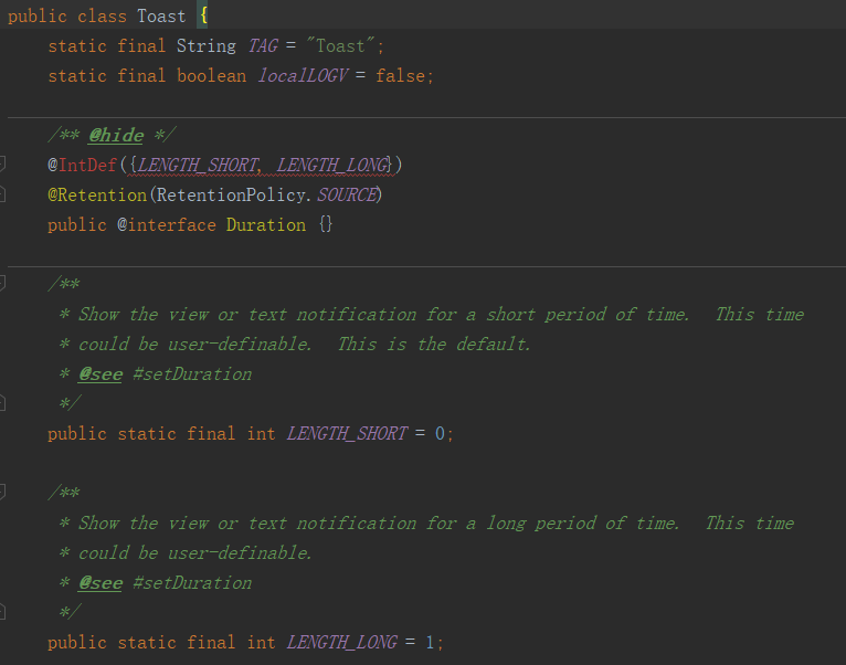 首先 WindowManager 并不能像 Toast 显示后自动消失,如果要像 Toast 一样自动消失很容易,在 WindowManager 显示后发送一个定时关闭的任务,那么问题来了,这个显示的时间如何定义?系统 Toast 显示的时间是什么样子?首先我们需要先看一下 Toast 给我们提供的两个常量值