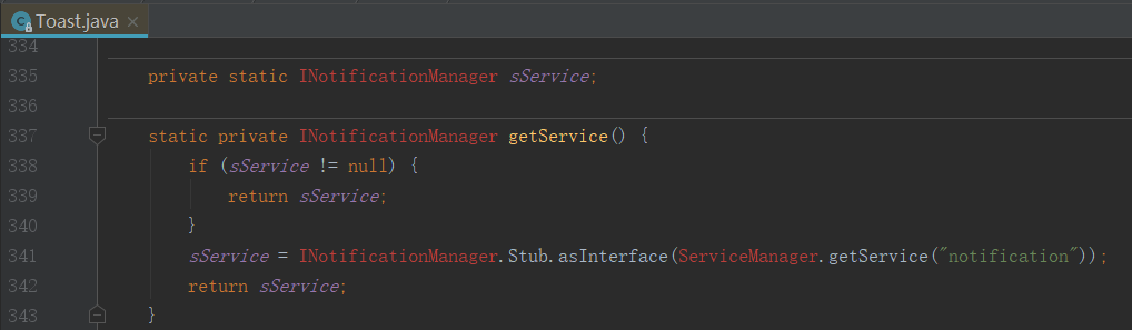 仔细观察的同学就会发现了,这个 show 的方法可不是像 cancel 一样只调用了 TN 内部类中的同名方法,还调用了 INotificationManager 这个 API,其实不难发现,这个 INotificationManager 是系统的 AIDL,不信的话我们再看一下这个 INotificationManager
