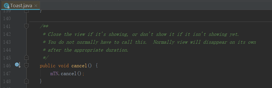 只需要稍微简单看一下就看懂,Toast 底层就是用这个内部类去实现,请记住,这个内部类叫做 TN,字段名为 mTN,接下来先让我们看一下 Toast 中 cancel 方法的源码
