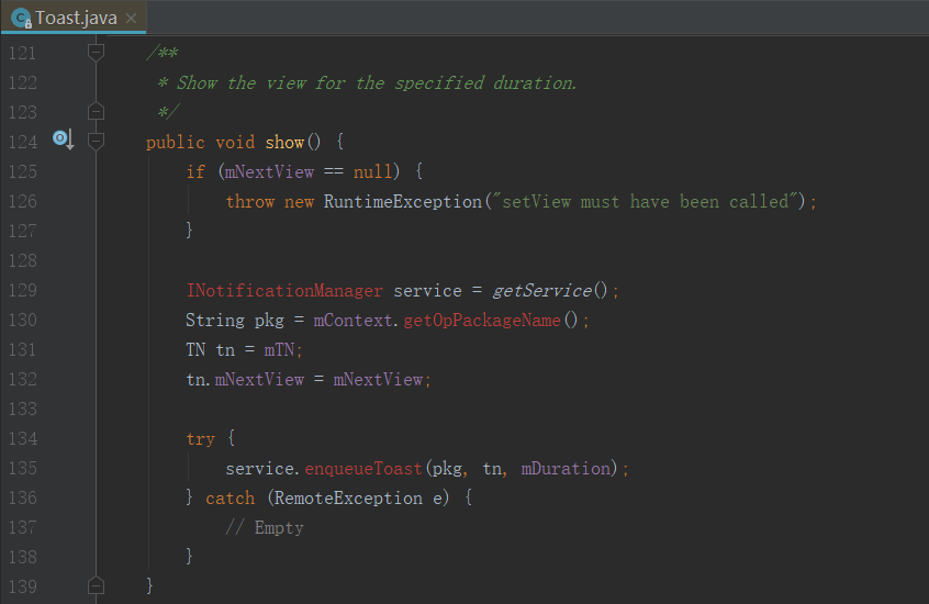 cancel最终还是调用了内部类 TN 中的同名方法,接下来再看 Toast 中 show 方法的源码
