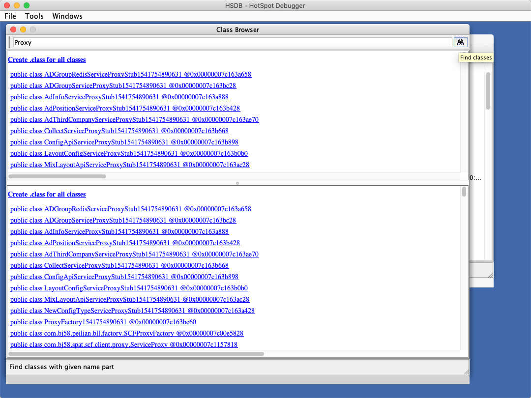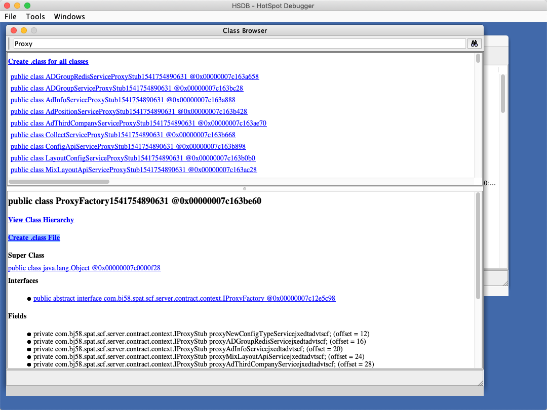 今天需要分析一个工程中的几个动态代理类,但是,这几个动态代理类是由javassist生成的,在target中是不存在其文件的,因此无法直接查看。然后搜索了一番,找到了使用HSDB(HotSpot Debugger)这个工具来查看的办法。
