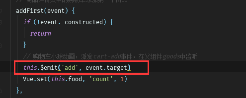 在goods组件监听add事件去触发addFood函数,从而去触发小球掉落动画函数,所以第一次添加商品时有动画