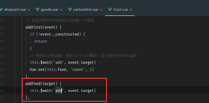 但后面在添加就没有了,通过打印发现,goods组件都没有进去addFood函数,也就是没有监听到cart-add事件(原因尚未弄明白),所以从food组件中引用的cartcontrol组件中去监听它自己派发的事件cart-add,触发函数addFood(随意命名,不同于goods组件的addFood函数),在addFood函数中再派发一个事件,让goods父组件去监听,从而触发goods中的addFood函数,再去触发小球掉落动画函数就可以实现完整的小球下落动画了