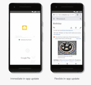 此 API 具有两个选项,第一个是进行关键更新的全屏体验,此种情况下,您希望用户可以等待应用立即应用更新。第二个选项是灵活更新,意味着用户可在更新下载完毕的同时继续使用该应用。您可以完整地定制更新流程,将其当作您应用中的一部分。