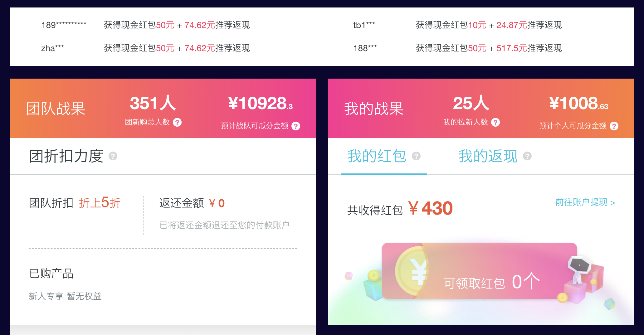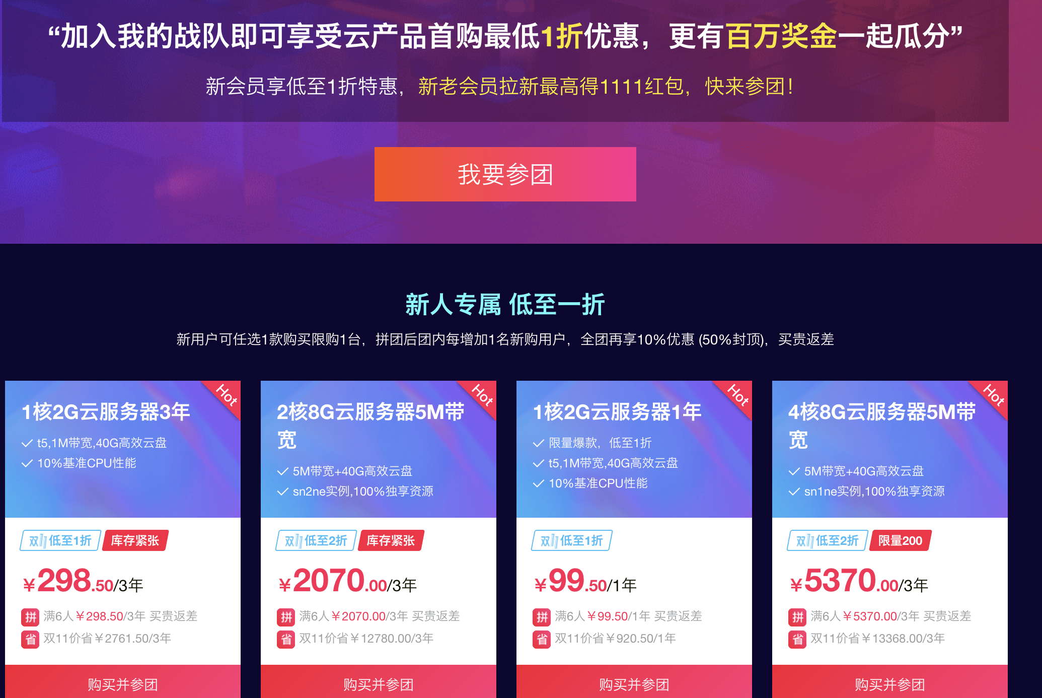 要是老用户的话可以用新开一个账号,用亲戚朋友的身份证认证一下也能享受1折优惠,加入我的战队(点击这里查看详),邀请一个人差不多能瓜分战队的 50元分红+50元现金红包+25%返现 。打个比方,假如你是新用户,你买了一个3年的云服务器一共300块,买过后,你成功邀请一人(下单3年的云服务器)就可分50(战队红包) + 50(现金红包) + 300*25%(返利红包)。相当于买服务器的钱回来了一半(折上5折),听着是不是很诱惑人,进来了解下吧;目前战队排名是top15,后名次靠前的话还有更大的优惠。m.aliyun.com/act/team111…