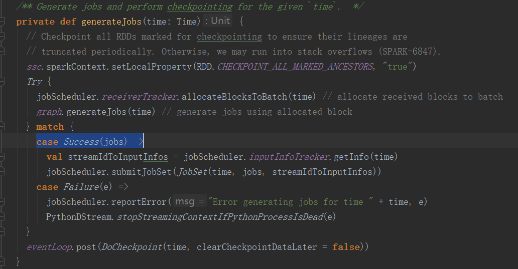 jobScheduler.receiverTracker.allocateBlocksToBatch(time) // allocate received blocks to batch -