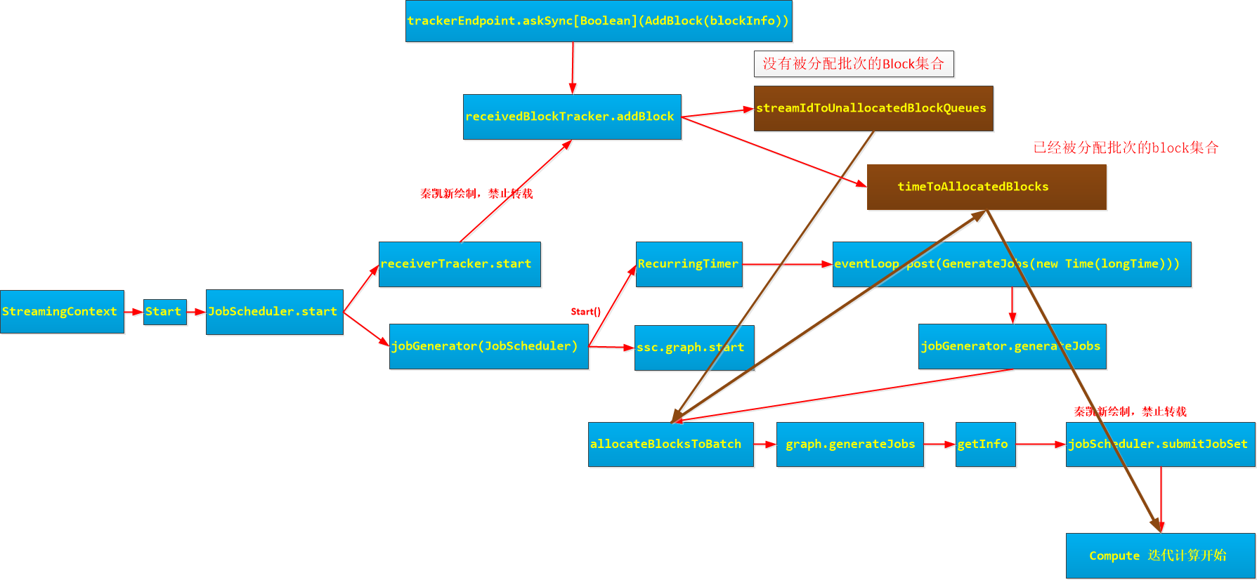 JobGenerator 最终启动ssc.graph和timer,因此整个处理逻辑开始启动了。
