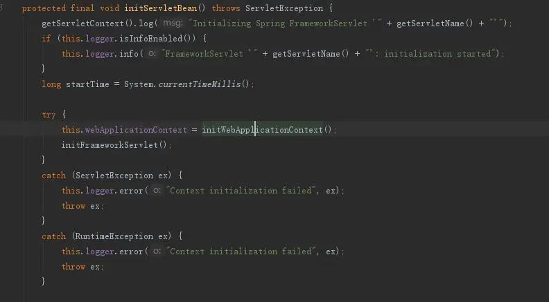 注意代码:initServletBean(); 其余的都和加载bean关系并不是特别大,跟踪进去会发I发现这个方法是在类:org.springframework.web.servlet.FrameworkServlet类中(是DispatcherServlet的父类、HttpServletBean的子类),内部通过调用initWebApplicationContext()来初始化一个WebApplicationContext,源码片段(篇幅所限,不拷贝所有源码,仅仅截取片段)