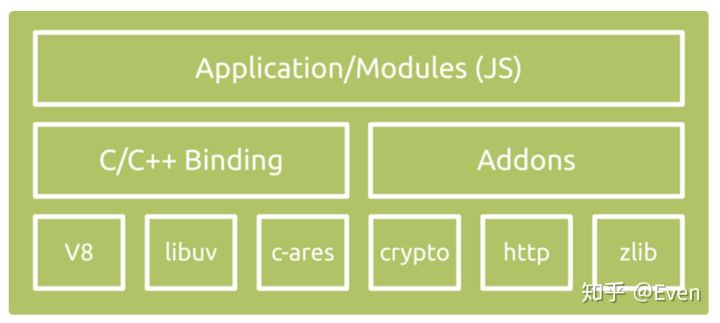 - Application/Modules: 这部分就是所有的 JavaScript 代码:你的应用程序、Node.js 核心模块、任何 npm install 的模块,以及你写的所有模块代码。你花费的主要精力都在这部分。