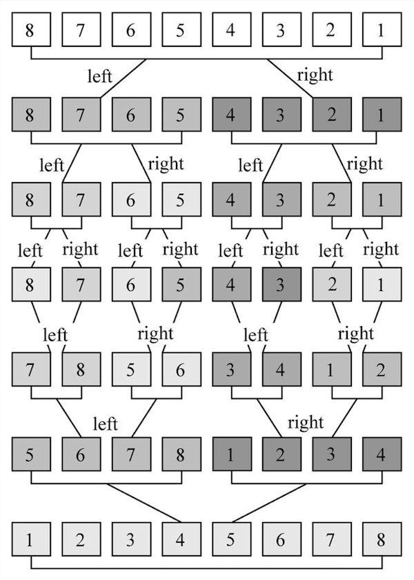 归并算法采用了分治法,具体思路是将原始数组切分为较小数组,直到每个小数组里只包含一个元素,然后再将小数组逐步归并成较大数组,同时进行排序,直到归并为一个排序完毕的大数组,如图所示: