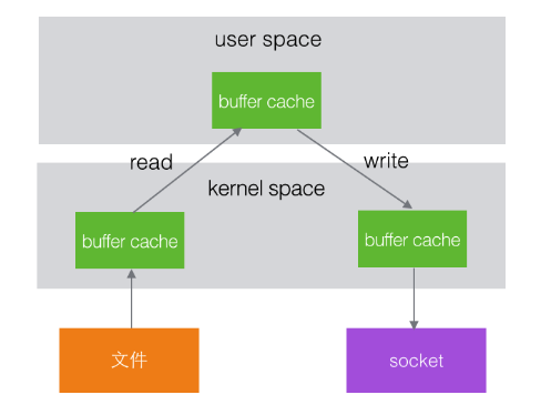 - 一个用户程序要把文件内容发送到网络这个用户程序是工作在用户空间,文件和网络socket属于硬件资源,两者之间有一个内核空间。因此在操作系统内部,整个过程为: