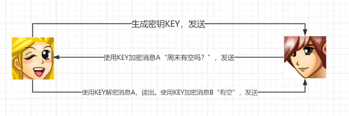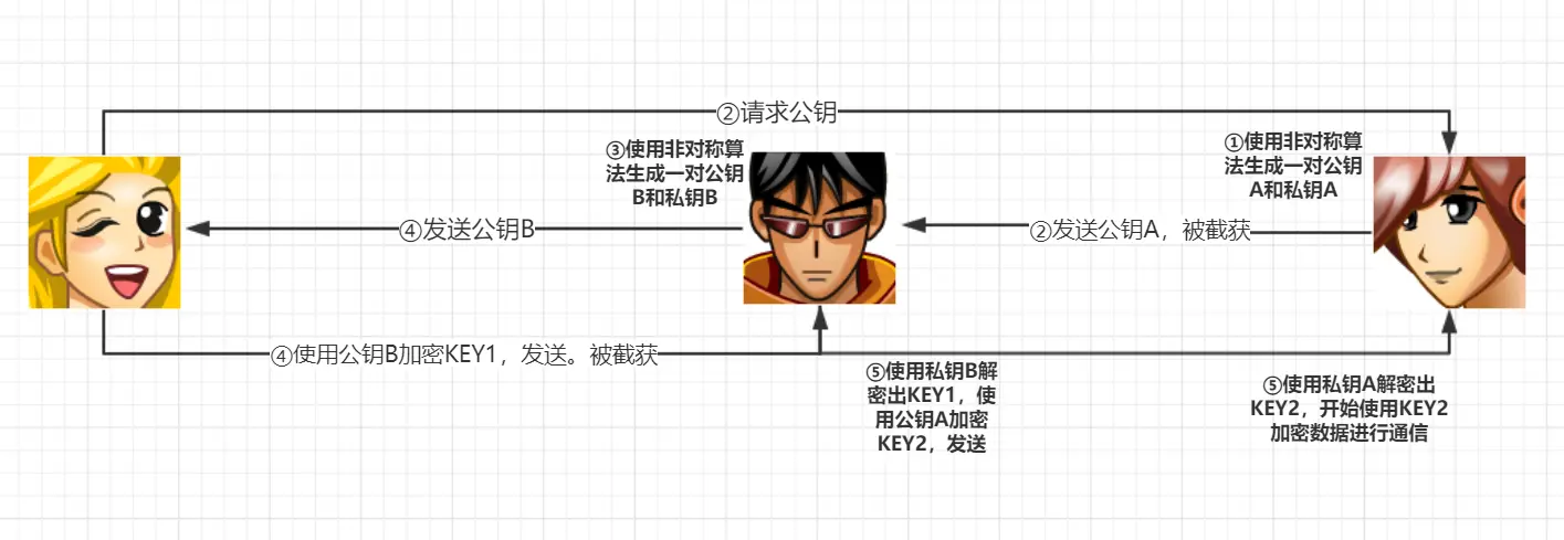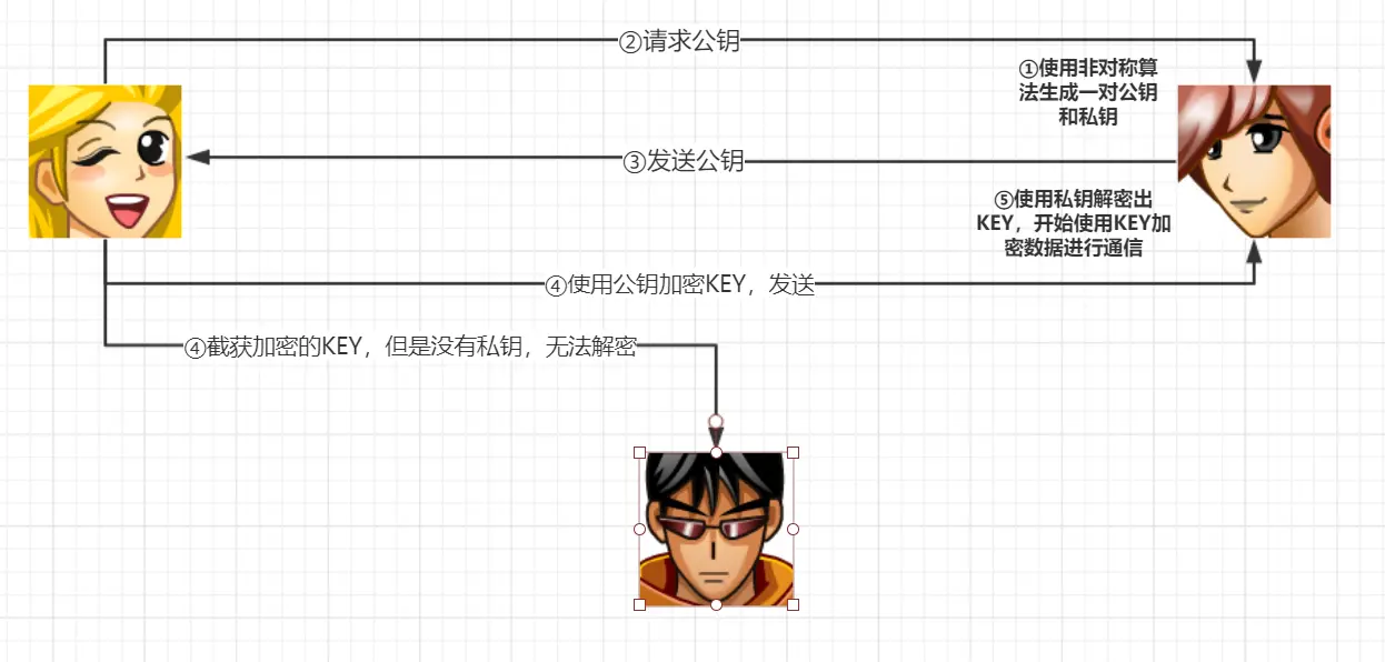 如果使用非对称加密,首先服务器生成一对公钥和私钥,将公钥发送出去;对方收到公钥后,本地使用对称加密生成一个密钥KEY,然后使用公钥加密这个密钥KEY,发送;服务器收到公钥加密的数据后,使用私钥解密,得到KEY。这时,双方可以使用KEY来加密数据,开始安全地交流。 (即使中间人截获了公钥加密的数据,但是由于没有私钥(私钥只有签发公钥的服务器保管,不会用于传输)所以无法解密出KEY。)