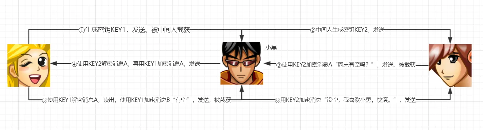 此时,产生了这种情况:客户端使用的是KEY1,服务器使用的是中间人伪造的KEY2,而中间人拥有KEY1,KEY2。所以中间人可以无限篡改数据。