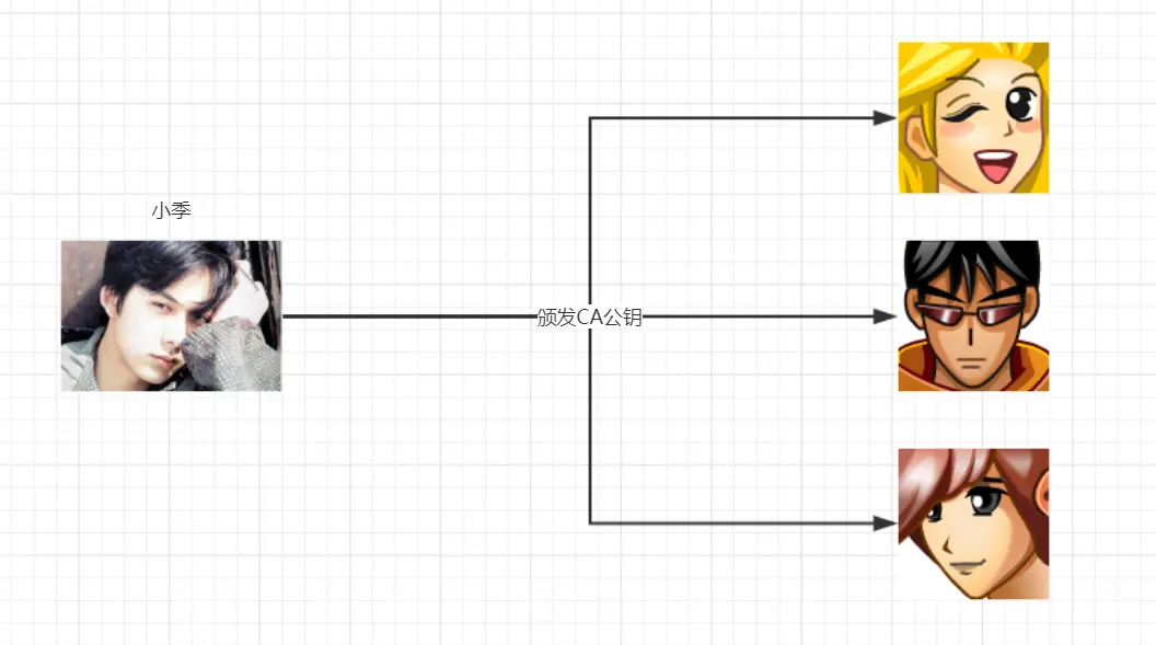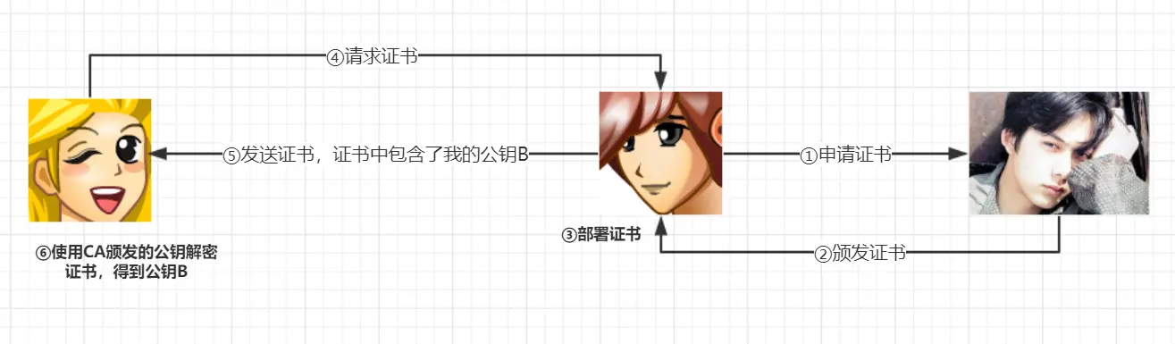 小季是这样来操作的:首先,每个同学在入学的时候,都会收到由学生会颁发的公钥A,而这个公钥A是绝对可信任的。以后,哪个同学谈恋爱了,需要串小纸条了,就到学生会小季处申请证书,证书将用于对你的公钥B进行加密,然后你将你的公钥B加密后传输给你的对象,因为他/她在开学之初已经收到了CA的颁发的公钥A,只要用这个公钥A来解密数据,若能解开,便能取出你的公钥B。