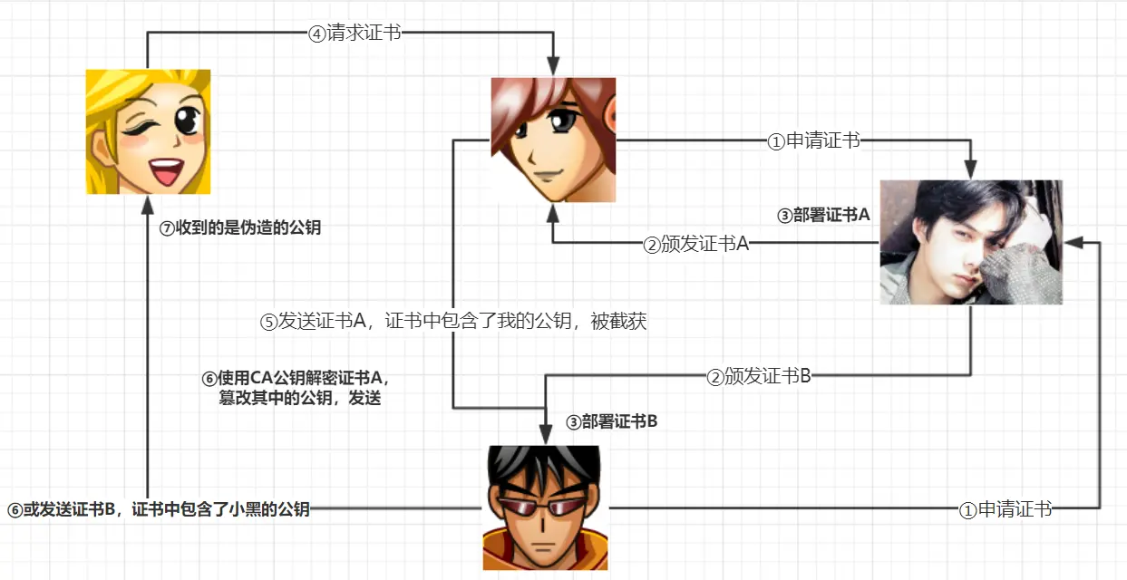 此时还有一个问题,因为不良少年也是学校里的学生,图一中可以看到,小季给不良少年也颁发了CA公钥,不良少年也是可以去向小季申请证书的。若不良少年截获服务器发送的证书,改成自己的,那岂不是又出现了不安全的问题?如下图: