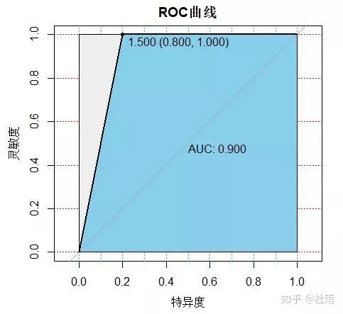 auc.polygon.col = "skyblue", print.thres = TRUE, xlab = "特异度", ylab = "灵敏度",