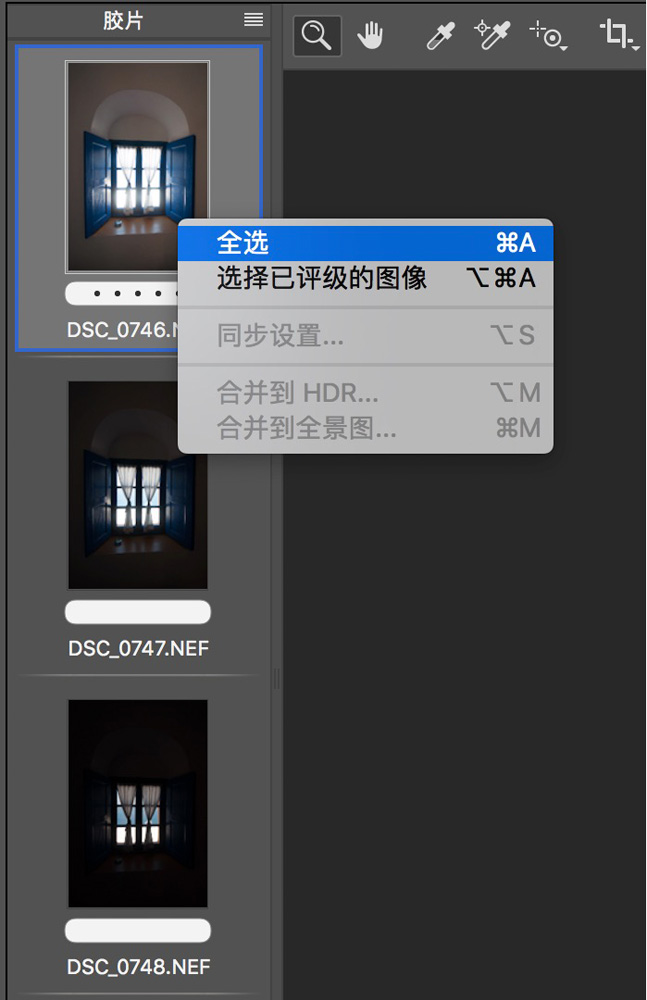 在ACR中打开照片之后,在软件左侧可以看到3张略缩图,鼠标右键点击任一一张略缩图,在菜单中选择“全选”。