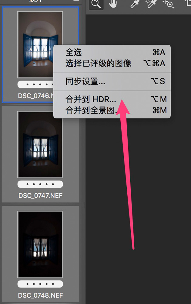全选之后,再点击鼠标右键,此时打开的菜单中,出现了“合并到HDR”的选项,选择此选项。