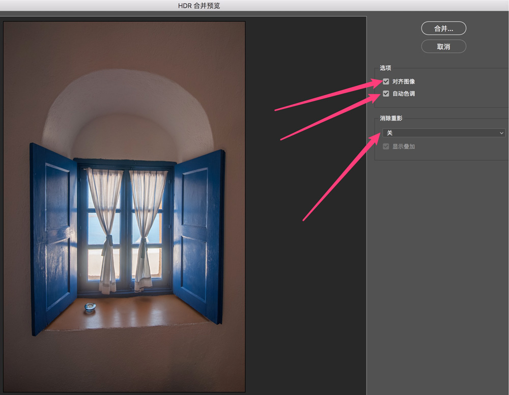 一会儿之后,我们就进入了HDR合成面板。面板上主要有3个设置项。