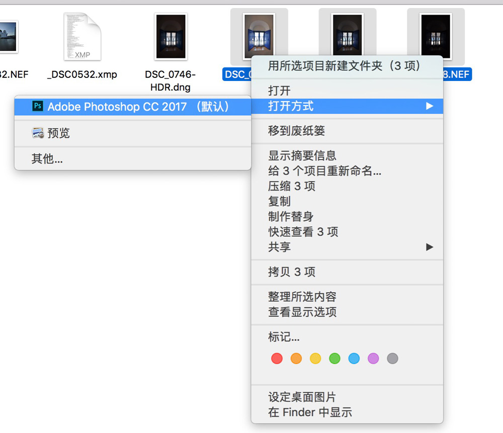 如果是使用Bridge浏览照片,也是选上3张照片,右键选择“在Camera Raw中打开”。