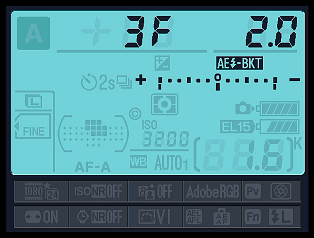 下面这张截图里相机肩屏的设置,3F表示包围张数为3张,2.0代表曝光补偿量为2EV。下面的方向显示中,从+到-都有,表示包围曝光时会双向包围。也就是相机会拍摄+2EV过曝2档,0EV正常曝光,-2EV欠曝2档,3张照片。