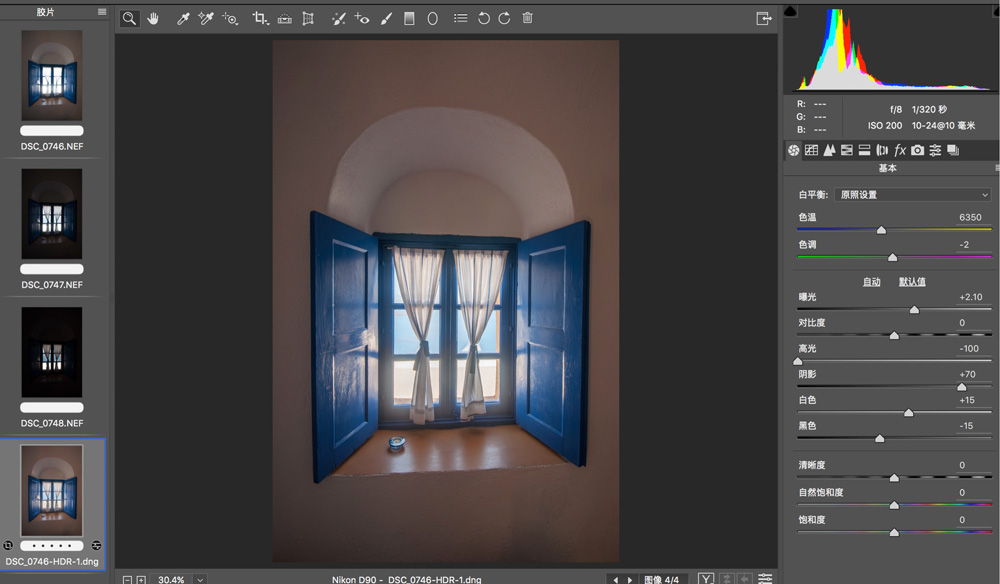 之后我们会再次进入ACR软件中,并且看到一张新的合成后的底片(DNG格式)。这张新的底片,包含了原来3张raw文件的全部信息,给后期调整提供了很大的空间。(比如单张raw文件的曝光滑块,我们最多只能加减5档,而HDR合成文件,ACR允许后期加减10档的曝光。)