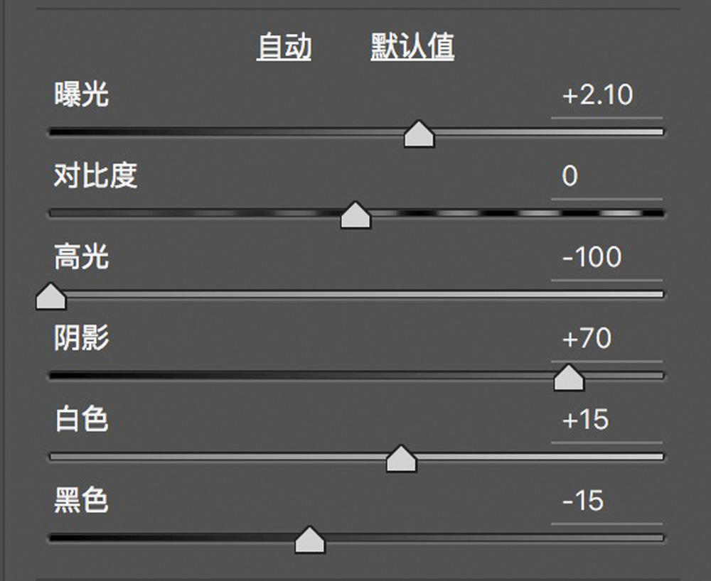 第二个是“自动色调”,这个选项我们也一般都勾上。勾上“自动色调”之后,ACR会自动调整照片的曝光度、高光、阴影、白色、黑色这几个滑块,让照片得到一个推荐的细节和对比程度。这些调整是非破坏性的,我们之后可以在基本面板中重新设置。