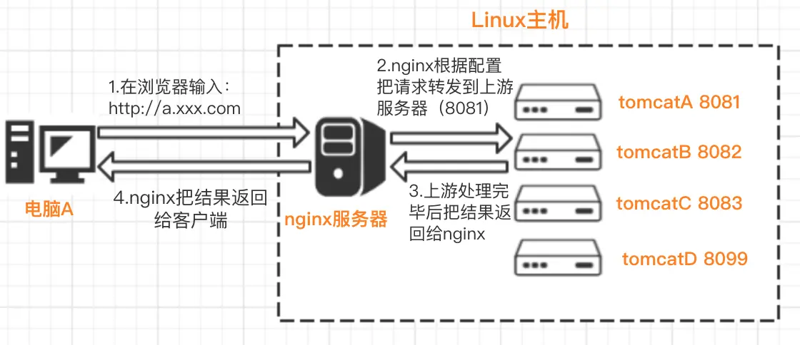 举个栗子:一个服务器的80端口只有一个,而服务器中可能有多个项目,如果A项目是端口是8081,B项目是8082,C项目是8083,假设指向该服务器的域名为www.xxx.com,此时访问B项目是www.xxx.com:8082,以此类推其它项目的URL也是要加上一个端口号,这样就很不美观了,这时我们把80端口给nginx服务器,给每个项目分配一个独立的子域名,如A项目是a.xxx.com,并且在nginx中设置每个项目的转发配置,然后对所有项目的访问都由nginx服务器接受,然后根据配置转发给不同的服务器处理。具体流程如下图所示: