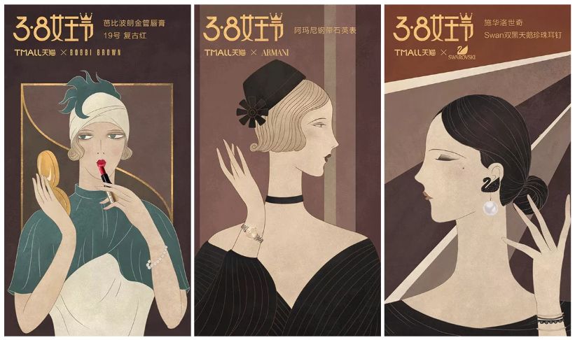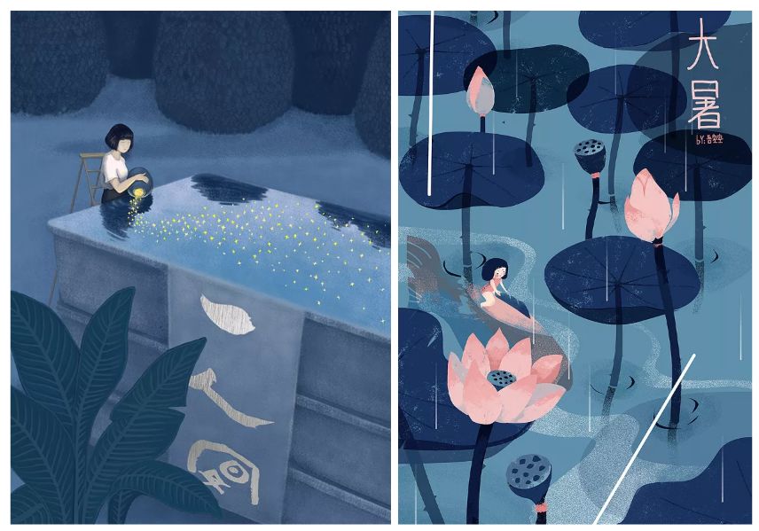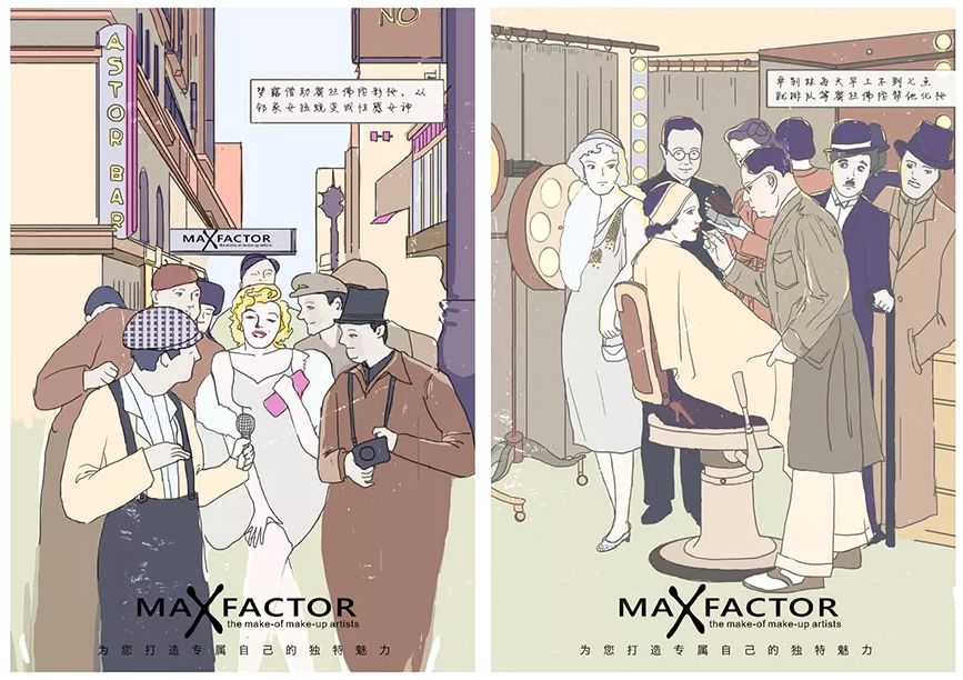 上下两组插画同样是以复古为主题,主色调同样是素色调,但辅色调的不同又决定了两组插画细腻风格的不同。