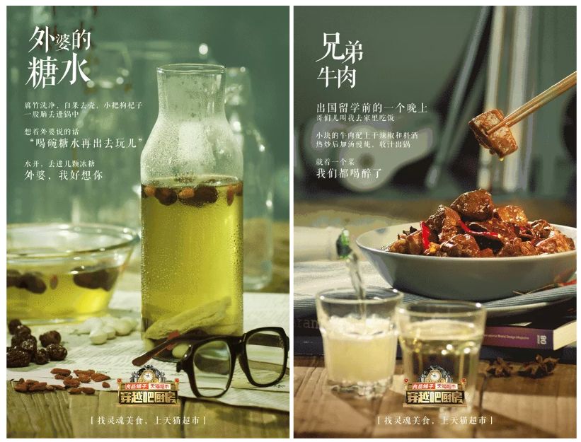 这组海报的主题是:夜深了,我有美食,你有故事吗?海报标题“外婆的糖水”、“兄弟牛肉”及下面的小段文字都描述了藏在美食里的那些牵动情感的往事。素色调的内涵属性很好地营造出了怀旧的故事感。