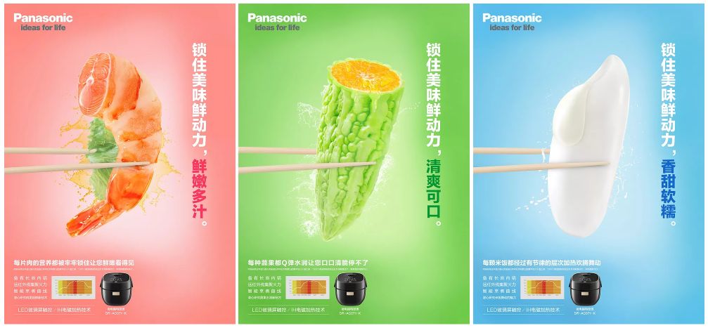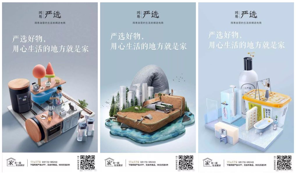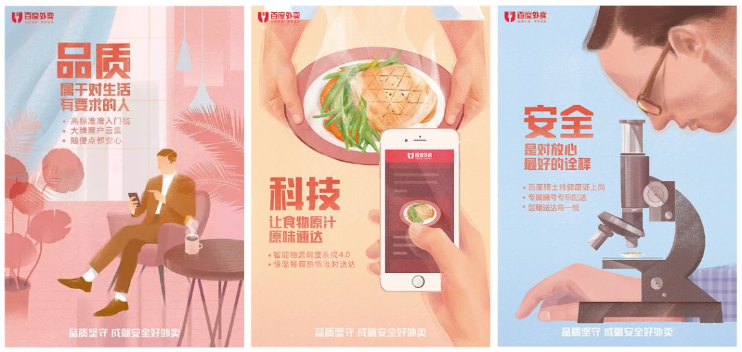 这组海报的主题是“品质坚守 成就安全好外卖”,如果单单从品质感体现这点来说,这组海报柔色调比重过大,显得比较柔和少女心,换成素色调更能体现品质感。