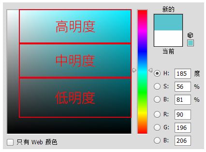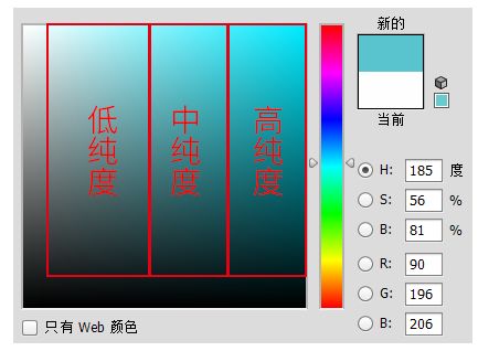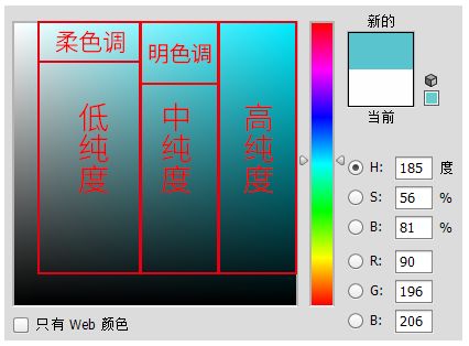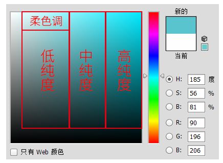 以青色为例,将色彩分为高纯、中纯、低纯,低纯部分即素色调。这里只是个大致的划分,事实上由于色相本身就有纯度差异,三原色(红绿蓝、青品黄)的纯度最高,其他混合色纯度偏低,比如青蓝、橙色、紫色之类的。所以实际应用中,这种划分并不是绝对的,需要灵活变化。