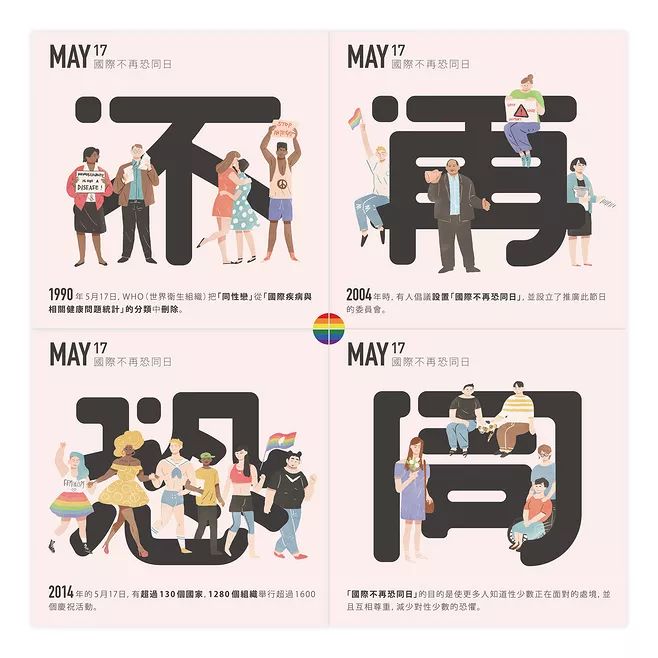 粉色的温柔感、黑色的力量感,这组海报的主题是以温柔有力的方式宣传“不再恐同”。