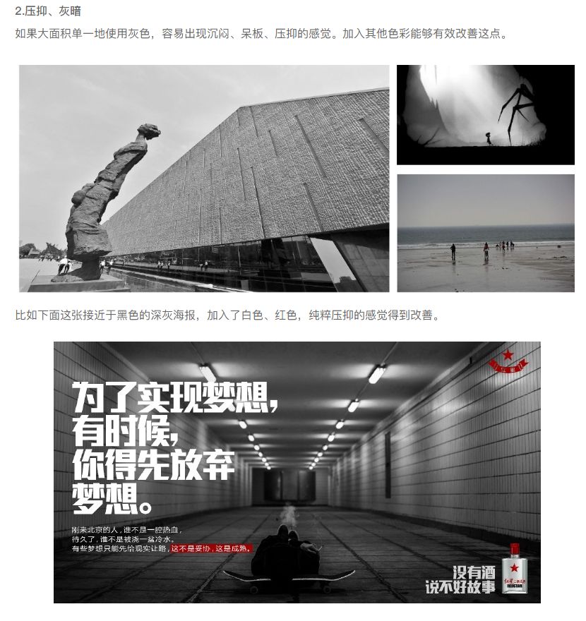 暗色调与《色彩解读之黑白灰》中黑色的特点极其相似,黑色篇里讲述地很详细了,可参考这篇https://www.zcool.com.cn/article/ZNzg5MzI0.html 加以理解。