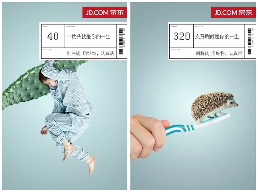 京东这组双十一前夕的海报,一为延续之前一直主打的“品质”路线,二给天猫的狂欢来盆巨大的冷水。而素色调+大面积留白很好地体现出了品质感、冷静的特点。