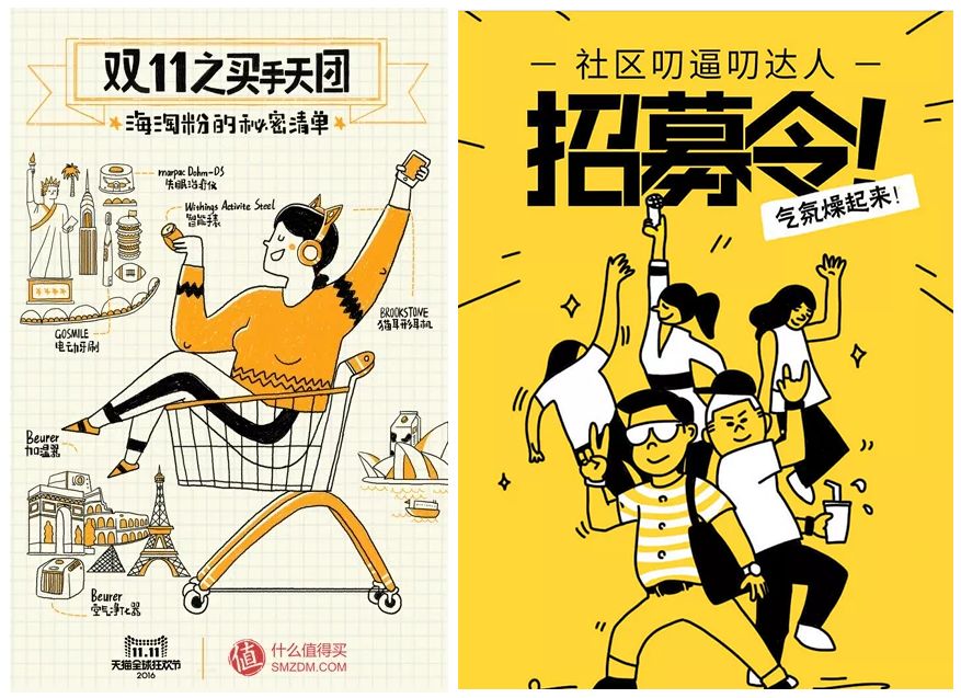 右图背景柔色调+人物部分明色调,整体风格柔和、明快。