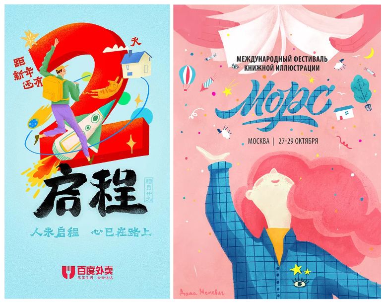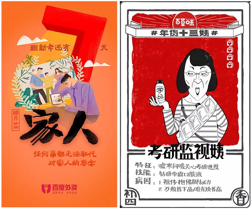 左图背景柔色调+红色纯色调,整体的风格是柔和中带着热烈、喜庆。