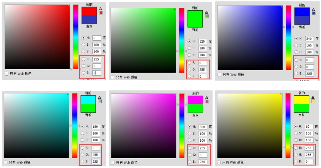 三原色(红绿蓝、青品黄)在色相条中的位置