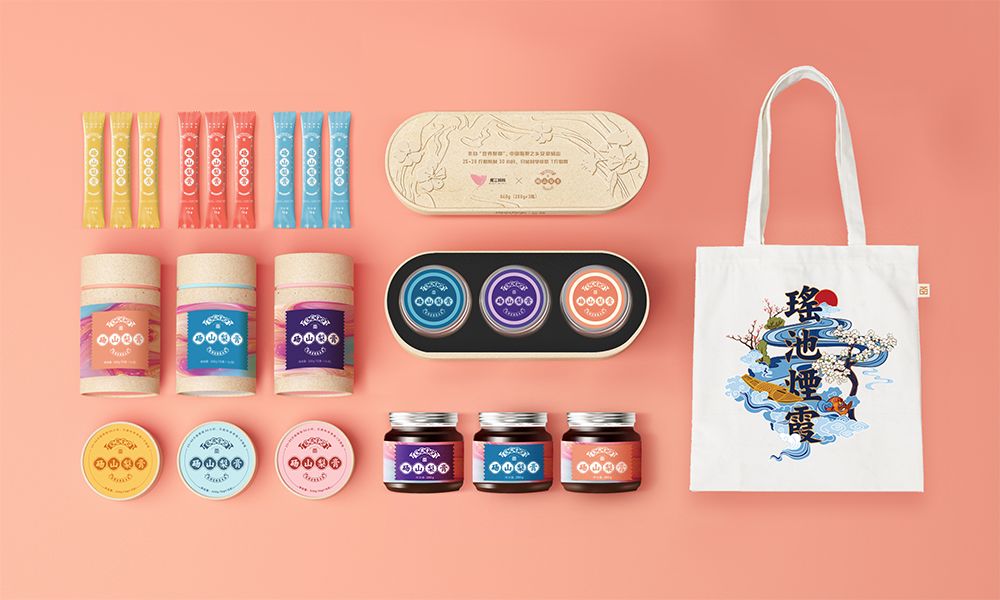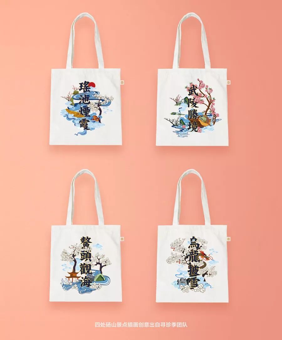 与“寻珍季”协作深挖砀山文化,并提供创意设计方案支持,以砀山黄河故道四处著名景点——“瑶池烟霞”、“乌龙披雪”、“鳌头观海”、“武陵胜境”为主题进行插画绘制,打造有文化内涵的环保帆布袋。