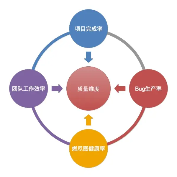 通过收集过程数据,从四个维度来评估项目质量,包括:项目完成率、Bug生产率、燃尽图健康率、团队生产效率: