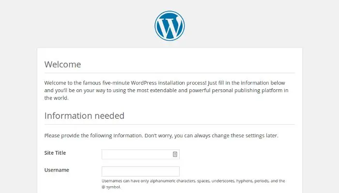 按下面的格式填写:为你的站点设置一个标题、创建一个用户名和密码、输入你的 email 地址。点击 “Install WordPress” 按钮,然后使用你刚刚创建的账号登录,你现在已经登录,而且你的站点已经设置好了,你可以在浏览器地址栏输入 http://localhost/wp-admin 查看你的网站。