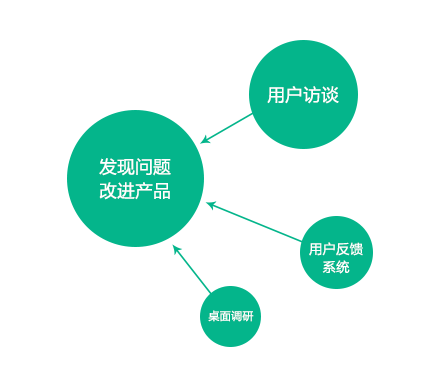 设计调研中的第一步也是最重要的一步,就是明确目标,并根据目标选择调研方法。易信的基础通讯功能(如免费短信、免费通话等)已经上线一年时间,属于已有的产品功能,因此,希望通过此次调研发现用户使用易信基础通讯功能的过程中的体验及功能上的问题,从而进行改进,提升产品体验。基于“发现问题—改进”的目标,选择了基于用户访谈为主,桌面研究和用户反馈为辅的调研方法,如图2所示。
