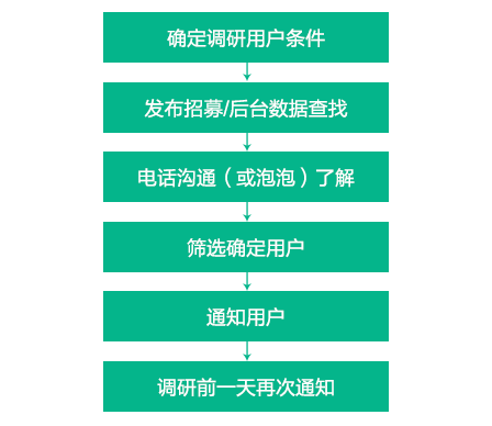在实际调研中,根据调研目标的不同,选择被调研的用户类型也不同。而易信基础通讯的调研,我们选择用户类型的过程:确定调研用户条件—发布招募/后台数据查找—电话沟通(或泡泡)了解—筛选确定用户—通知用户—调研前一天再次通知,见图3,整个过程中,用户选择的基础是调研用户的条件,比如说需要安卓机使用和苹果使用各一半;需要经常使用免费短信(一天5-10次);热情开朗;非技术等。选择合适的用户,将使调研事半功倍,并可能会带来意想不到的一些惊喜。而选择不合适的用户,将会使访谈者很痛苦,比如说在“铭记”中提到的例子,访谈者需要不停的将其拉回需要了解的内容上。因此,选择合适的用户,就等于成功了一半。