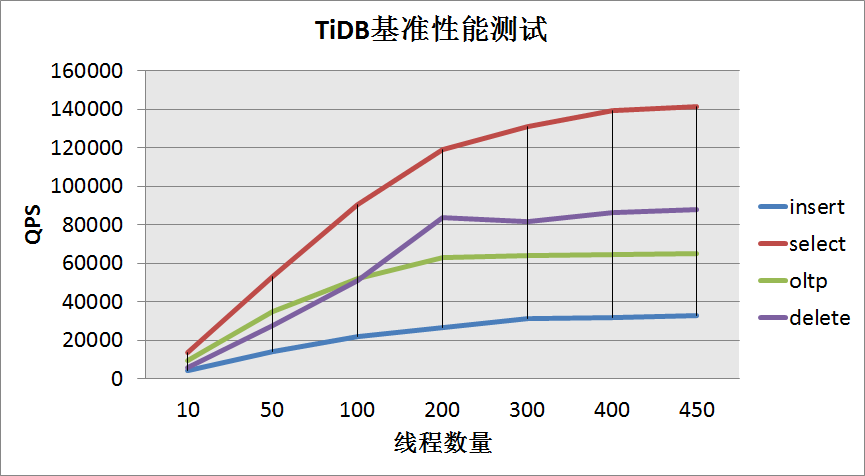 TiDB 的基准测试,使用的工具是 sysbanch 进行测试,使用了 8 张基础数据为一千万的表,分别测试了 insert,select,oltp 和 delete 脚本得到数据如下,查询的 QPS 达到了惊人的 14 万每秒,而插入也稳定在 1 万 4 每秒。