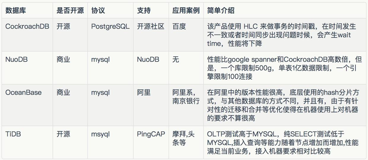 根据以上期望进行分析,我们分析了目前市面上存在的 NewSQL 分布式数据库,列表如下: